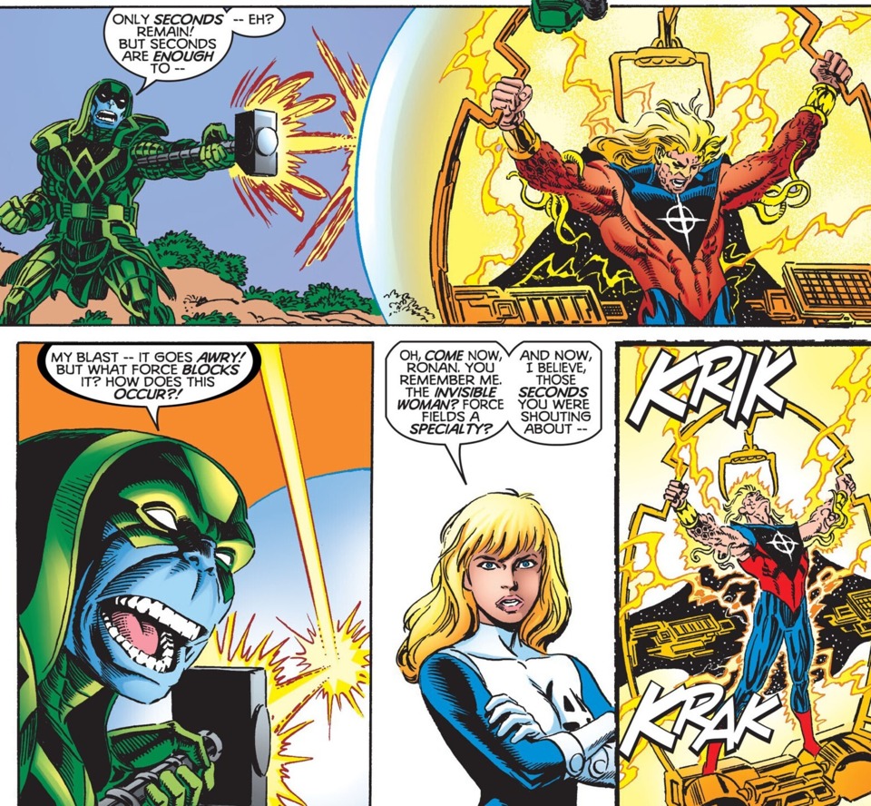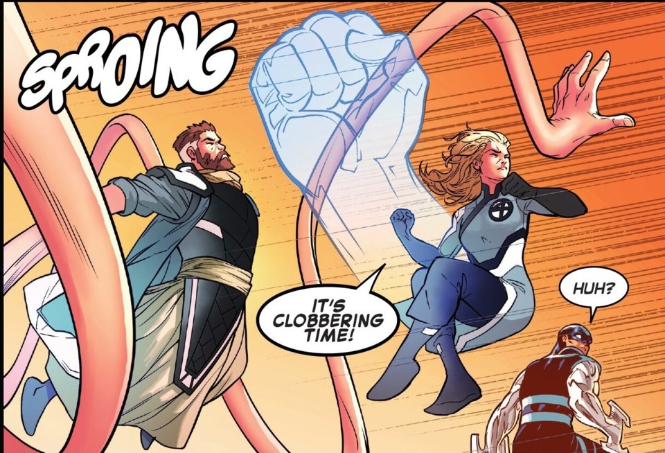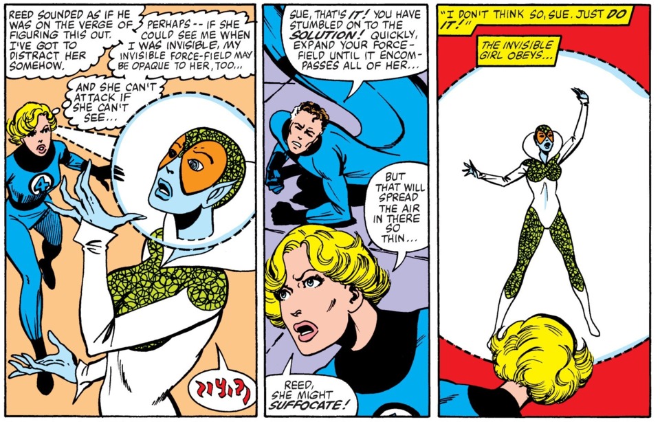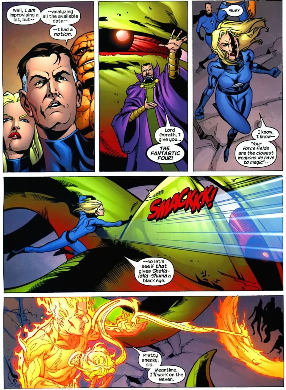 Sue Storm vs Mary Marvel (Low - Mid Diff): Base wise physically, she sits around town to city level in attack power but that barely matters when her High-Outer constructs and forcefields, which completely eclipse Mary’s stats across the board. Her power is explicitly stated to originate from the same realm as the Celestials, which explains why she can breach their armor and shield herself from their attacks. She has blocked blows from Green Scar Hulk while he's shown stalemating Sentry and fighting a Zom-possessed Doctor Strange, which lines up with her also enduring Sentry’s punches. She has pushed back Knull’s forces, tanked Wolverine’s adamantium claws, which have pierced Hulk, Thor and Thanos, and kept pace with Namor. She has trapped Gladiator, beaten She-Hulk, and pressured the Avengers, including both Hulk and Thor. Her forcefields has tanked hits from Mjolnir, pierced Galactus, restrained the Thing, hold off Fin Fang Foom, tanked hits from both the Thing and Johnny Storm, block attacks from Galactus, beams from Blaastar, energy outbursts of Norrin Radd and and Terrax combined, Ronan the Accuser's Universal Weapon and most notably, a full attack from an adult Franklin Richards and even contained his raw energy output as a child. With Franklin stated to be a threat to Multi-Eternity and can reshape the entirety of the Nexus of all Realities which exist inside the White Hot Room (3 Layers into High-Outer). She's broken through Doom's magical shield which I've previously stated could block attacks from Captain Britain, whose strong enough to tear the Omniverse asunder, and has also defeated Agatha Harkness, who herself can hold off Dormammu with Sue being able to harm him as well, consistent with her capable of staggering Mephisto in his realm, knocking out Shuma Gorath and casually dealt against a room full of mindless ones. In terms of versatility, she keeps up with fighters like Iron Fist, Doctor Doom, Namor, Sersi and even her own equal in direct physical combat. Sersi, who as an Eternal, has damaged Hercules and other Eternals, which further reinforces the scaling here. On top of all that, she possesses strong tactical intelligence and combat awareness, letting her leverage these advantages efficiently rather than relying on brute force alone, which is proven here, where she consistently performs a signature move of which includes suffocating her oponents to dura neg them, capable sealing magical spells which could be effective against Mary whose magic based, execute omnidirectional AoE attacks that could easily breached the speed gap, can amp herself with a pseudo armour around her physically or conjure up weapons to compete in a direct fight and telepathically overwhelm her and throw her around. Yeah, Sue is taking this no matter what, which should also justify why Ratio's take on Sue losing to Star Sapphire being wrong.